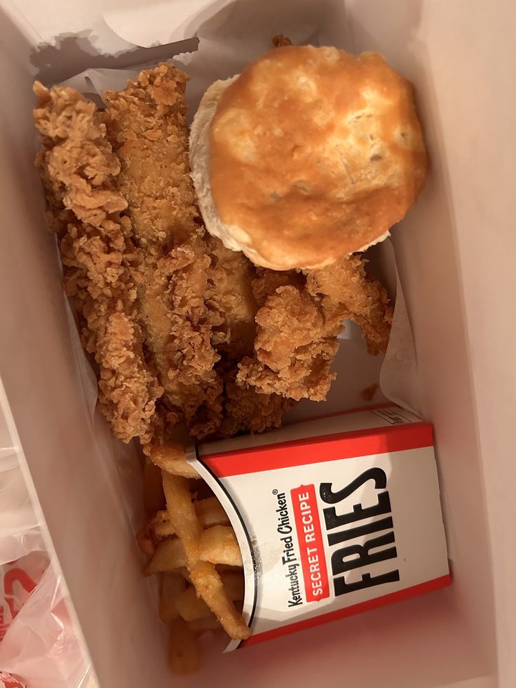 3 Extra Crispy Tenders, 1 side of your choice, a biscuit, a cookie, your choice of a dipping sauce, and a medium drink.